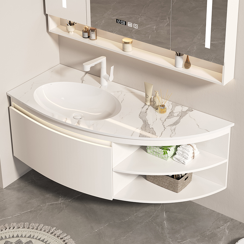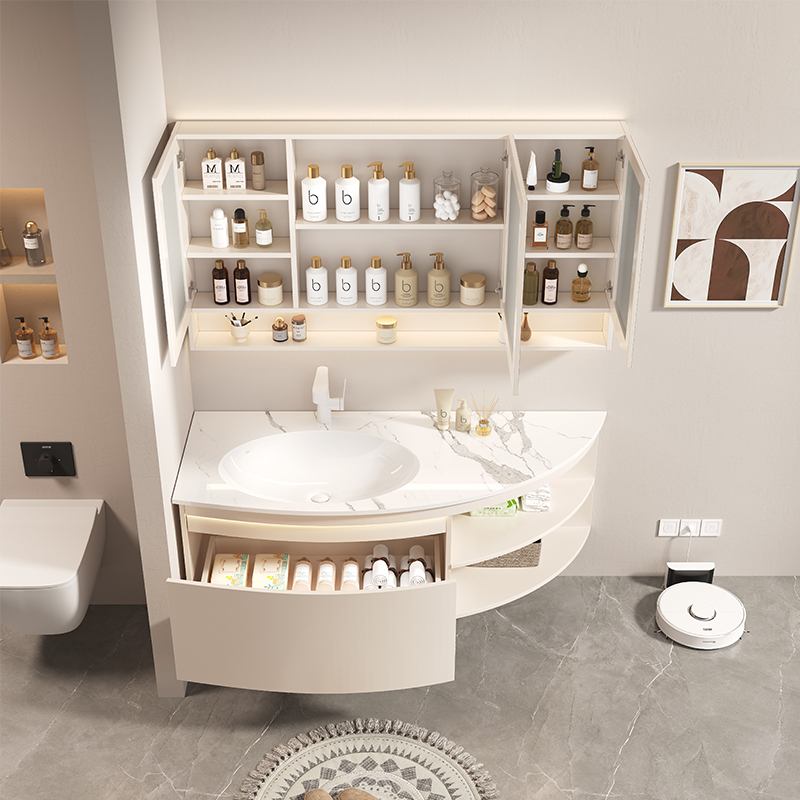 ✅ Hidden Storage + Open Shelving: Concealed toiletry compartments paired with decorative open shelving for clutter-free elegance.