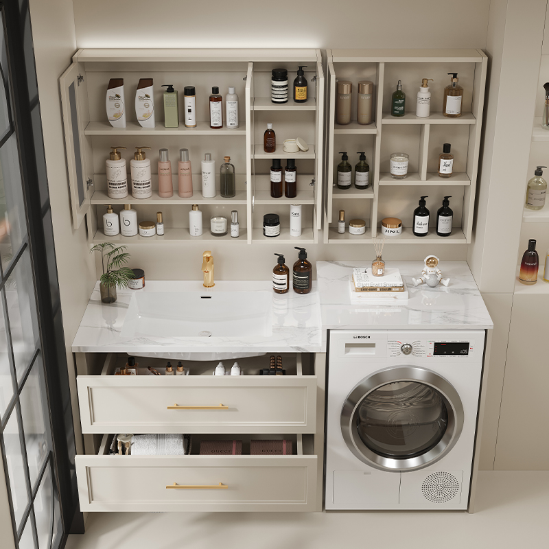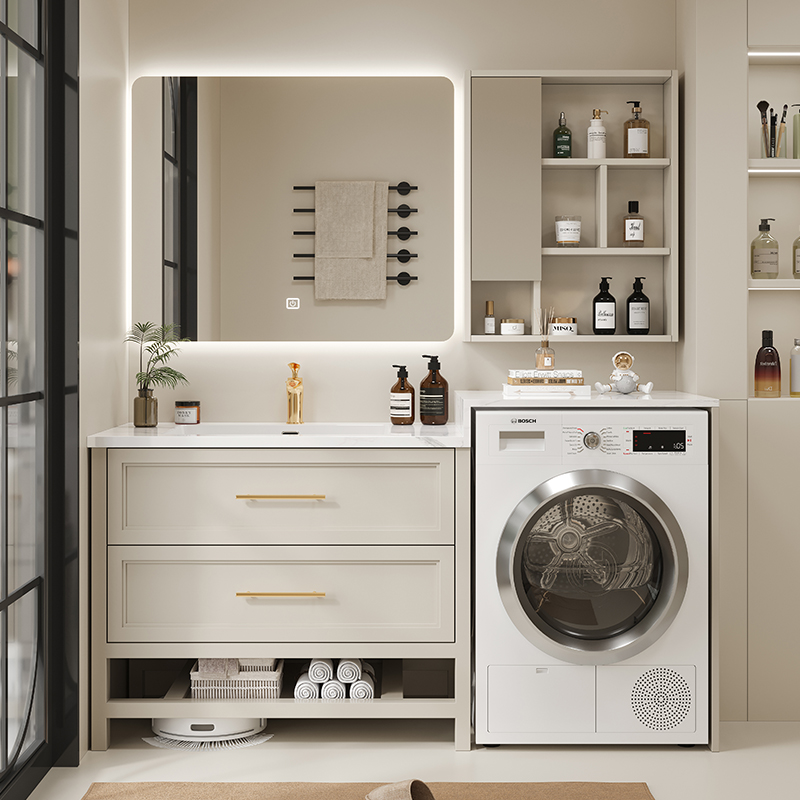 ✅ Hidden Storage + Open Shelving: Concealed toiletry compartments paired with decorative open shelving for clutter-free elegance.