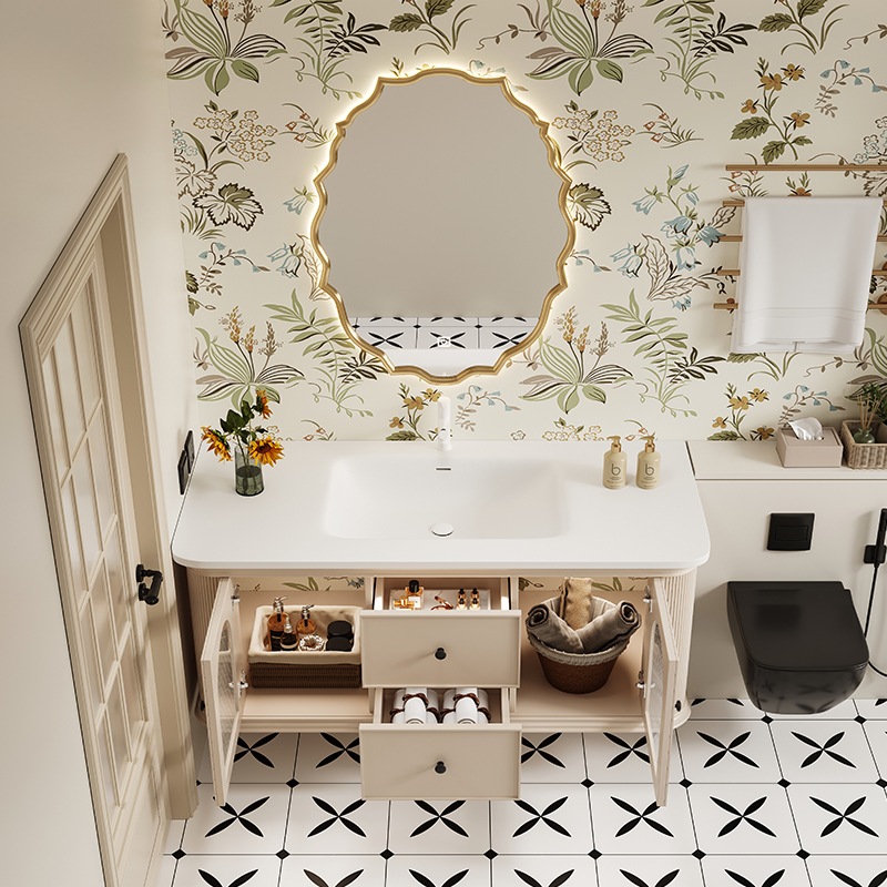 ✅ ​Hidden Storage + Open Shelving: Concealed toiletry compartments paired with decorative open shelving for clutter-free elegance.