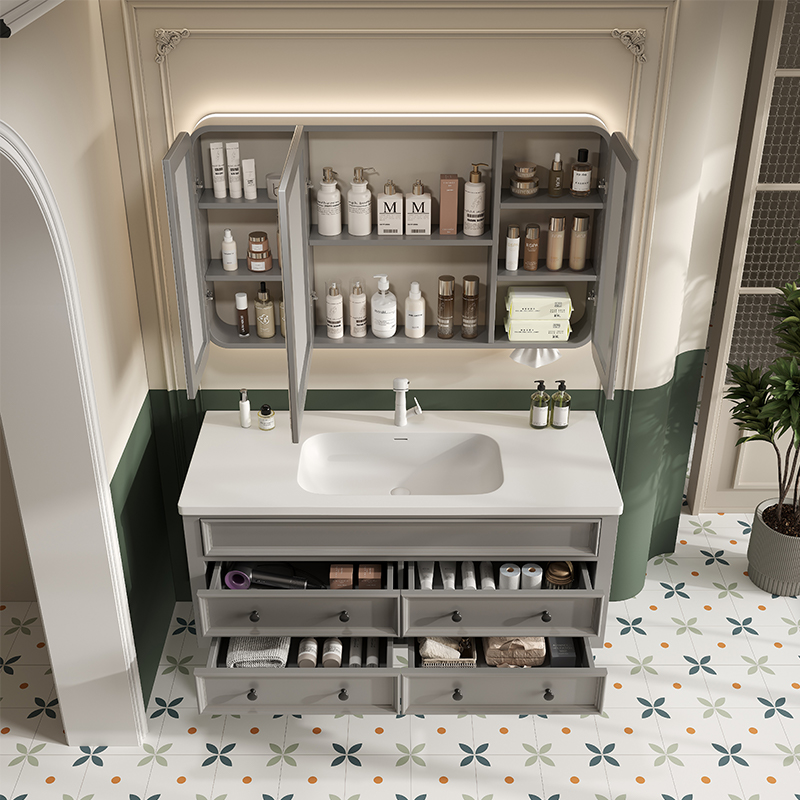 ✅ ​Hidden Storage + Open Shelving: Concealed toiletry compartments paired with decorative open shelving for clutter-free elegance.