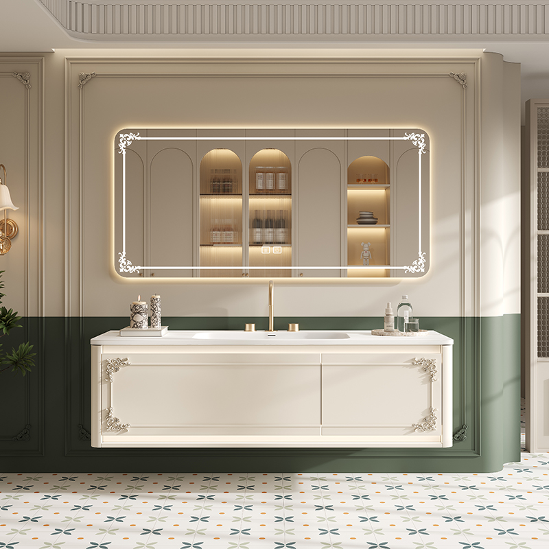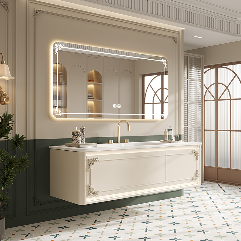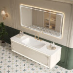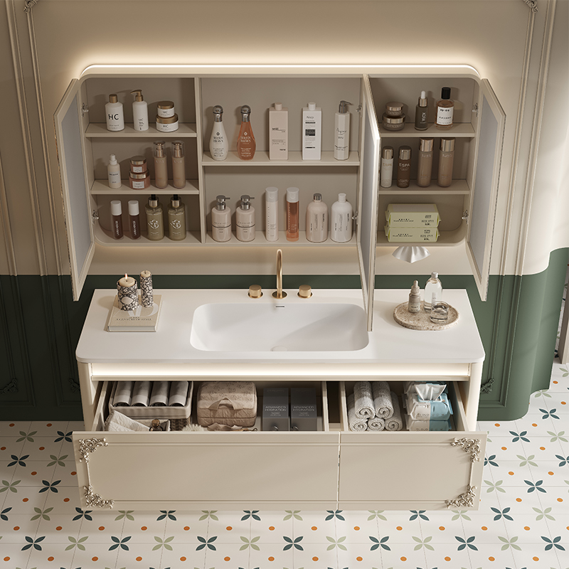 ✅ Hidden Storage + Open Shelving: Concealed toiletry compartments paired with decorative open shelving for clutter-free elegance.