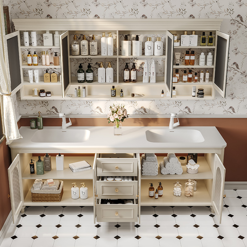 ✅ ​Hidden Storage + Open Shelving: Concealed toiletry compartments paired with decorative open shelving for clutter-free elegance.